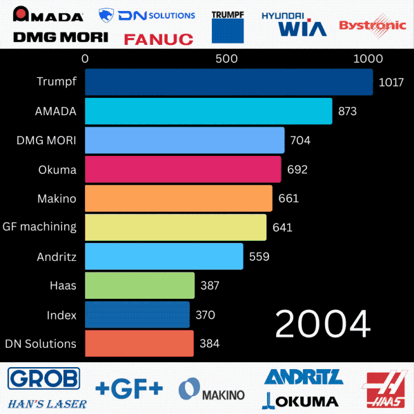 还有一张来自Martin Engels的动图很是成心思,具有丰硕的消息量,展现了过去20年,行业领先的机床制制商(TOP10)正在发卖额(百万欧元)方面是若何演变的。